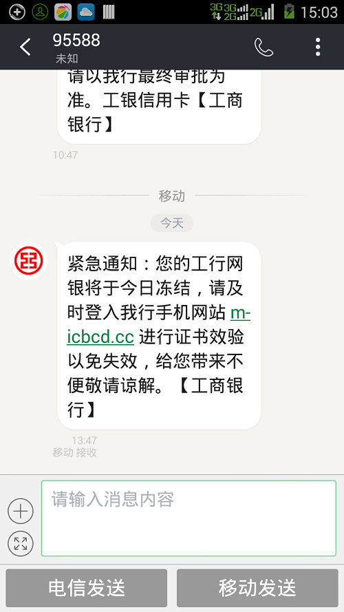 今天,騙子們用工商銀行的特服號(hào),95588給我發(fā)了一條手機(jī)病毒短信,上面的網(wǎng)址,一看就不是工商銀行的。如下圖: