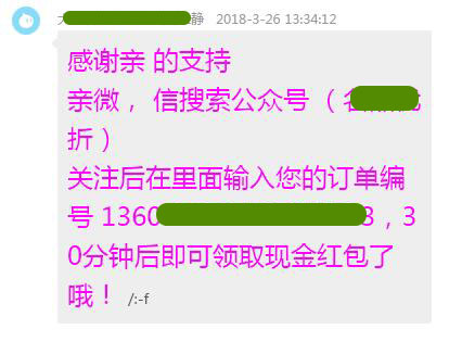 大家看到了嗎,紅包暫時是拿不到的,還要按著他們的要求,繼續(xù)做, 1、要關(guān)注他們的微信公眾號 2、要輸入訂單號 3、30分鐘后才能拿到現(xiàn)金紅包 至此,我已經(jīng)感覺到是套路了,騙子的套路都是這樣的,一步一步的牽著鼻子走。 我已經(jīng)決定不要這個紅包了,因為我不知道后面還要我做什么, 而且,這個紅包也不大,估計是1塊或者2塊錢的小紅包,還要做這么多,得不償失。 在此,也勸大家以后要注意了。 |
