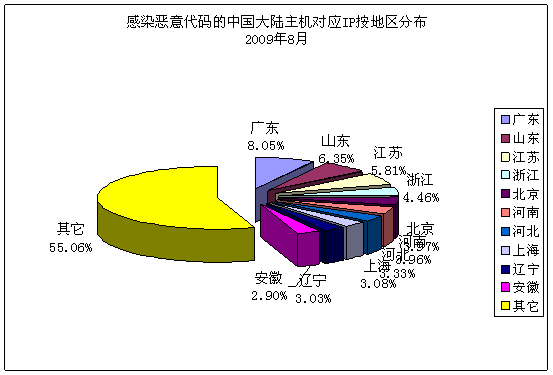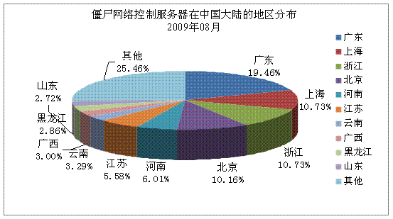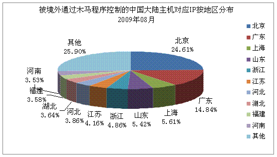 |   一、河南互聯(lián)網(wǎng)應(yīng)急中心事件處理情況   八月份,我中心共處理2起互聯(lián)網(wǎng)安全事件。國(guó)家互聯(lián)網(wǎng)應(yīng)急中心發(fā)現(xiàn)我省某地市政府網(wǎng)站掛馬。我中心及時(shí)將事件信息通報(bào)相關(guān)電信運(yùn)營(yíng)企業(yè),要求相關(guān)電信企業(yè)及時(shí)協(xié)調(diào)處理,網(wǎng)站現(xiàn)已恢復(fù)正常。   二、基礎(chǔ)電信運(yùn)營(yíng)企業(yè)及網(wǎng)絡(luò)安全企業(yè)上報(bào)情況   八月份,我省各基礎(chǔ)電信運(yùn)營(yíng)企業(yè)及網(wǎng)絡(luò)安全企業(yè)共上報(bào)網(wǎng)絡(luò)安全事件84起,其中河南電信公司上報(bào)11起,河南移動(dòng)公司上報(bào)3起,河南天融信上報(bào)63起,河南山谷上報(bào)1起,世紀(jì)信安上報(bào)6起。相關(guān)電信運(yùn)營(yíng)企業(yè)已及時(shí)處理所上報(bào)安全事件。   三、河南省網(wǎng)絡(luò)安全事件分析   (一)木馬事件數(shù)據(jù)   2009年8月1日至31日,CNCERT/CC對(duì)當(dāng)前流行的木馬程序的活動(dòng)狀況進(jìn)行了抽樣監(jiān)測(cè),發(fā)現(xiàn)我國(guó)大陸地區(qū)23398個(gè)IP 地址對(duì)應(yīng)的主機(jī)被其他國(guó)家或地區(qū)通過(guò)木馬程序秘密控制,其分布情況如下圖所示,最多的地區(qū)為北京市(24.61%)。其中,我省受控IP地址為826個(gè),排名第10。    另外,根據(jù)國(guó)內(nèi)木馬控制服務(wù)器IP地址分布情況看,廣東最多,達(dá)7489個(gè),河南排第5,共有3651個(gè)。   (二)僵尸網(wǎng)絡(luò)情況   2009年8月1日至31日,CNCERT/CC對(duì)僵尸網(wǎng)絡(luò)的活動(dòng)狀況進(jìn)行了抽樣監(jiān)測(cè),發(fā)現(xiàn)國(guó)內(nèi)699個(gè)IP地址對(duì)應(yīng)的主機(jī)被利用作為僵尸網(wǎng)絡(luò)控制服務(wù)器,僵尸網(wǎng)絡(luò)主機(jī)數(shù)目有117852個(gè)。其中,我省僵尸網(wǎng)絡(luò)控制服務(wù)器數(shù)量為42個(gè),僵尸網(wǎng)絡(luò)所感染的主機(jī)數(shù)量為6476個(gè)。   1、僵尸網(wǎng)絡(luò)控制服務(wù)器數(shù)量按地區(qū)排名   下圖是根據(jù)僵尸網(wǎng)絡(luò)控制服務(wù)器的數(shù)量,按地區(qū)繪制的Top10分布圖。我省8月份僵尸網(wǎng)絡(luò)控制服務(wù)器數(shù)量在全國(guó)排第5位。    2、僵尸網(wǎng)絡(luò)所感染主機(jī)數(shù)量按地區(qū)排名   下圖是根據(jù)僵尸網(wǎng)絡(luò)所感染主機(jī)的數(shù)量,按地區(qū)繪制的Top10分布圖。從圖中可以看到,我省僵尸網(wǎng)絡(luò)所感染主機(jī)數(shù)量在全國(guó)排第8位。    3、僵尸網(wǎng)絡(luò)控制服務(wù)器使用的控制端口分布   下圖是僵尸網(wǎng)絡(luò)控制服務(wù)器使用的控制端口分布圖,從圖中可以看到,56.38%的僵尸網(wǎng)絡(luò)控制服務(wù)器通過(guò)6667端口對(duì)目標(biāo)計(jì)算機(jī)進(jìn)行控制。    (三)網(wǎng)頁(yè)篡改情況   2009年8月1日至31日,我國(guó)大陸地區(qū)被篡改網(wǎng)站的數(shù)量為3693個(gè),其中,我省被篡改網(wǎng)站數(shù)量為402個(gè),排名全國(guó)第2。    網(wǎng)頁(yè)篡改事件中,排名前三位的攻擊者的名稱分別是:用幸福觸摸憂傷@W.S.H,攻擊511次;雨夜孤魂,攻擊200次;Killer,攻擊74次。   (四)惡意代碼捕獲情況   1、惡意代碼捕獲次數(shù)排名   下表是通過(guò)蜜網(wǎng)捕獲的惡意代碼樣本及其變種數(shù)量前10名: