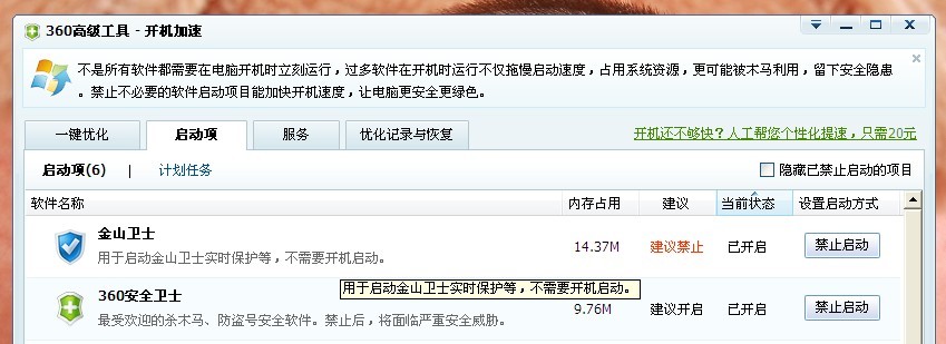 我在自己的電腦上,同時安裝了360安全衛(wèi)士和金山衛(wèi)士,然后都運(yùn)行優(yōu)化功能,發(fā)現(xiàn)以下結(jié)果: