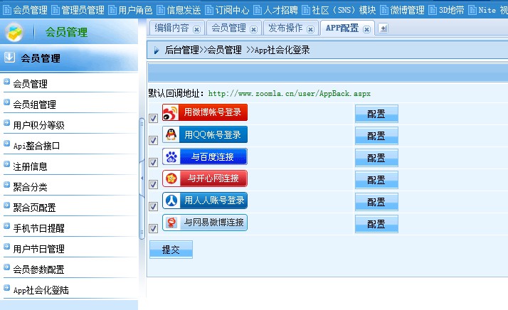 全新集成新浪微博、百度、QQ互聯(lián)、網(wǎng)易、人人、開心六大網(wǎng)站社會(huì)化登陸, 為站點(diǎn)贏得更多流量與會(huì)員, 提升網(wǎng)站會(huì)員粘度。 同時(shí)全面做化URL路徑, 支持更多的格式生成, 面向HTML、SHTML、短路徑生成, 使SEO與收錄效果更佳, 即使是默認(rèn)動(dòng)態(tài)頁面, 也以短路徑類靜態(tài)模式呈現(xiàn), 一切為了站長,一站面向優(yōu)化, 最優(yōu)網(wǎng)站,選擇最優(yōu)Zoomla!逐浪CMS! 歡迎廣大站長用戶下載體驗(yàn),免費(fèi)在線體驗(yàn): 前臺(tái):http://demo.zoomla.cn 后臺(tái):http://demo.zoomla.cn/manage 用戶名:admin 密碼:admin888  |
