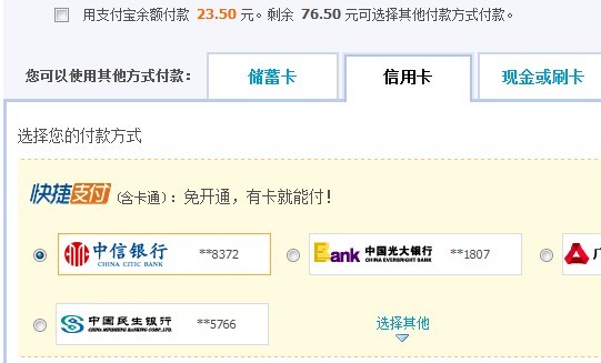 選擇支付寶之后,還可以選擇儲蓄卡、信用卡等進行支付