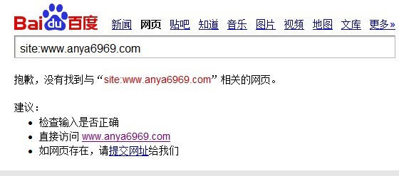| 我正在優(yōu)化的一個網(wǎng)站,優(yōu)化詞:廣告扇、廣告扇子、廣告扇廠,網(wǎng)址:www.anya6969.com,排名一下在第一頁。今天早上,客戶給我打電話說,網(wǎng)站在百度里找不到了。我趕緊上百度搜索查詢: