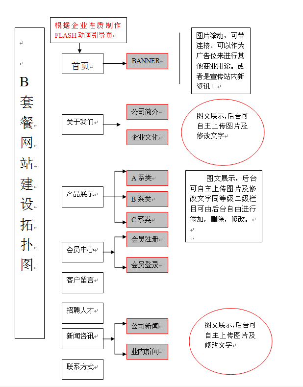 | 網站功能項目 | | B套餐介紹 | 說 明 |  | 適合類型 | 網站風格精致美觀,充分體現現代化企業形象,提高企業知名度 |  | 網站功能欄目 | 精美風格手工設計一套8個一級欄目。子頁面18個左右,50張圖片精美處理 |  | 超值小禮包贈送 | 300萬封廣告郵件群發。三千多家門戶平臺免費廣告推廣群發一次 |  | 項目團隊 | 資深設計師2名,設計師助理1名,高級程序工程師1名,策劃人員1名,項目經理一名,共6人團隊 |  | 網站包括功能欄目如下 | (1)網站首頁:首頁FLASH大型動畫(五秒內),五年以上經驗(高級設計師)手工制作,符合客戶的品牌形象提高,宣傳企業及產品為主,提高企業知名度。 |  | (2)公司介紹:企業全面介紹包括,企業文化、廠房圖片、技術實力、資質認證等介紹二級欄目無限發布上傳 |  | (3)產品/業務發布中心:以圖文形式介紹公司主營產品、最新產品或業務服務等內容二三級欄目無限制發布增刪。上傳后臺簡易方便。 |  | (4)簡易會員中心:瀏覽者在線填寫注冊表,經系統審核后實時成為網站會員,頁面填加登錄驗證功能,前臺會員可自行維護個人注冊信息,可對個人注冊信息進行修改和刪除,如遺忘密碼可在線查詢密碼 |  | (5)客戶留言:是一個客戶與企業之間的一個互動小平臺,可提交訂單,意見與建議,提交到網站后臺。管理員可選擇留言內容在不在前臺里顯示 |  | (6)招聘人才:接受職位申請,可以直接發簡歷到相關的郵箱。可以自由后臺管理(審閱、通過、刪除) |  | (7)聯系方式:有個平面地圖,聯系地址,手機賬戶 |  | (8)IP流量統計器,可查看每天、每時、每分、每秒來訪者信息統計 |  | (9)友情鏈接 |  | 后臺應用程序系統 | (1)公司介紹/關于我們:后臺自主操作上傳,二級欄目 |  | (2)產品/業務發布中心:客戶端顯示產品分類,各系列產品(圖片,文字),瀏覽最新產品等,管理后臺可在線添加分類、添加產品、在線上傳圖片、自主后臺管理 |  | (3)會員中心:后臺設置會員管理界面,管理員可對會員信息進行分類查詢(日期、姓名)、刪除。注冊會員價,管理員后臺修改.. |  | (4)留言板:后臺管理,可前臺發布填寫提交到網站后臺 |  | (5)在線客服:在線QQ、MSN、SHEY |  | (6)網站IP流量統計器:可看到每天、每小時、每秒過訪的IP地址,查詢訪客的網絡區域IP地址 |  | (7)招聘人才:可以自由后臺管理(審閱、通過、刪除) |  | (8)友情鏈接:在后臺可更改想要鏈接的其他網站,如百度、GOOGLE其他相關企業等 |  | 頁面優化 | 對每個頁面進行優化,如:突出相關主題,在每個網頁的標題上進行關鍵字排列,方便baidu ,google ,yahoo等國內外搜索引擎檢索收錄,以便提高公司相關關鍵字的排名;幫助在互聯網上突出地位,樹立品牌形象。如:在每個頁面都加入關鍵字眼,幫助提高互聯網的相關關鍵詞的排名;根據不同欄目,進行網站速度優化,讓網頁能占最少的資源(CPU,內存等),能最快的運作