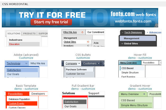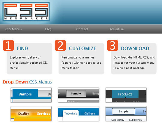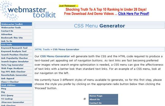 Colors Pallete Generator是一個在線查看圖片配色的服務。colors pallete generator 只需要上傳圖片,或者輸入圖片的網絡地址,其便可以分析出此圖片應用的配色方案。 CSS Menu Generator by Webmaster Toolkit