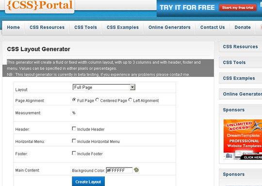 CSS Layout Generator 是一款在線工具,用于創建HTML+CSS 模板(layouts)。